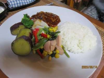 コーンのバター炒め、さつま芋のソテーやブロッコリーを添えました