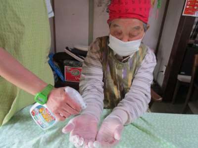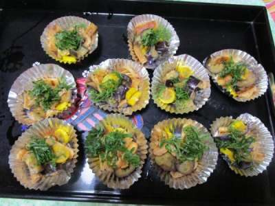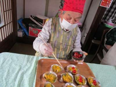 母たちの連携プレーでおかずをお皿に盛り付ければ