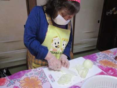 ハンバーグのタネに使う玉ねぎを見事な包丁さばきで