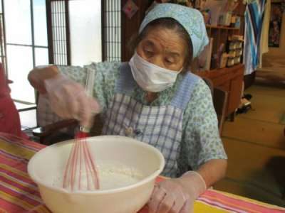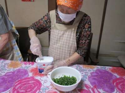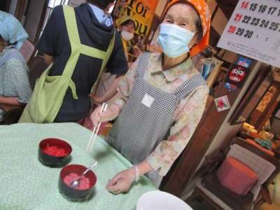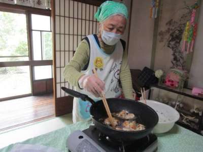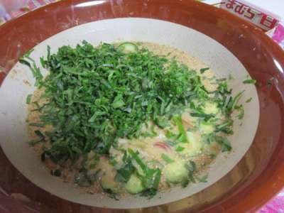 手前にある紫蘇を早わざできざみ 次の作業に取り掛かる母