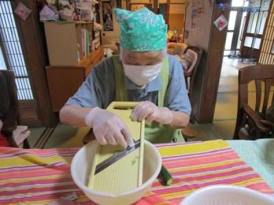 父も きゅうりをスライスして