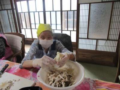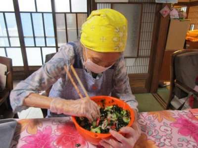 キノコを切り終えた母は ワカメの酢のもの和えに