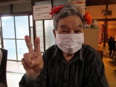 頭に髪飾りを着けたお茶目な父をパシャリ