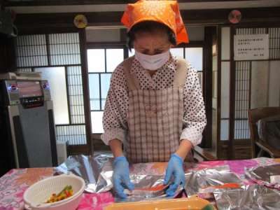 包んだ鮭をホットプレートで焼いていきますほっとした顔