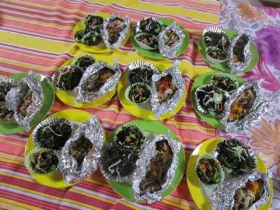 この上にきのこや玉ねぎをのせて包んでいきます指でOK