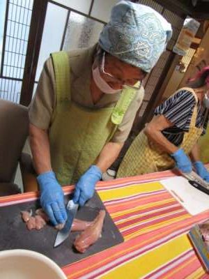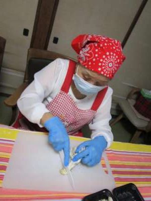 エノキ・舞茸を細かく切っていきますうれしい顔