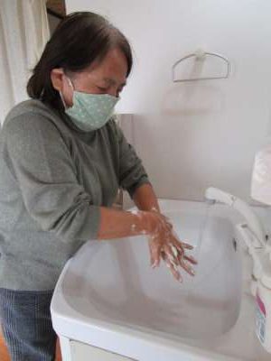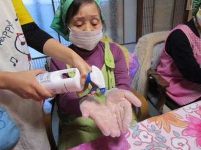 エプロン・三角巾・マスク・手袋をつけて手消毒もバッチリしたら