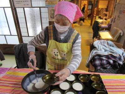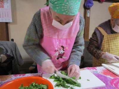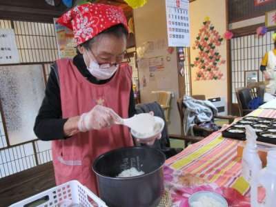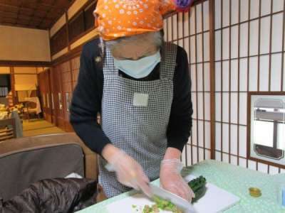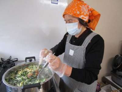 キッチンでは、大きな鍋でお味噌汁作り