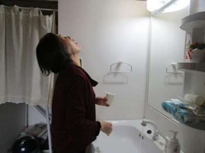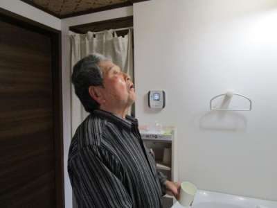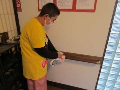 よく触る手すりも念入りに消毒しますほっとした顔