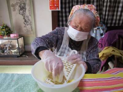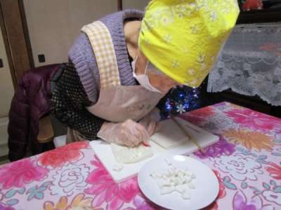 母はバナナを切って豆乳バナナヨーグルトづくり