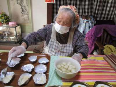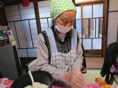 おにぎりを2つずつ並べて先ほど母たちがカニカマと