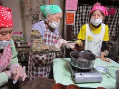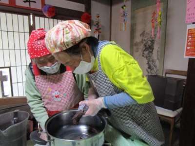 力のある長ちゃんがあんこを鍋に絞り出しています