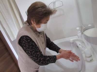 石けんをしっかり泡立てて 手を洗い