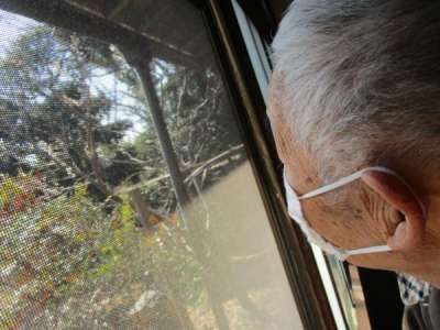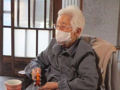 廊下で日向ぼっこをする父