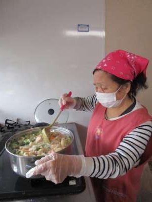 キッチンで大鍋でお味噌汁作り