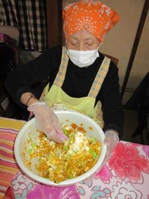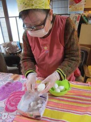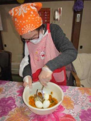かぼちゃ、枝豆、ゆで卵をまぜて