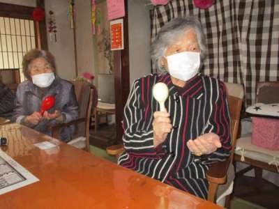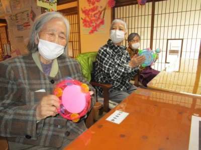 楽しく歌い歌声にマラカスやタンバリンを打ちながら