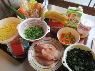 マカロニ、きゅうり、ツナ、コーン、人参をまぜて