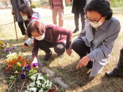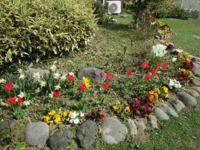 和みの幸望庵の花壇には、春を感じるお花がいっぱいチューリップチューリップチューリップ