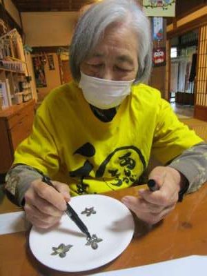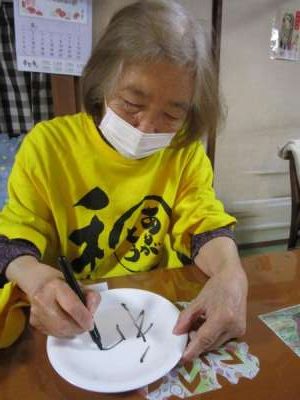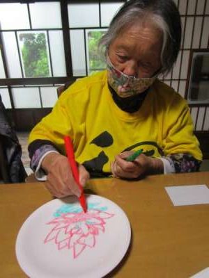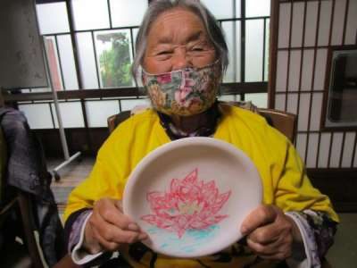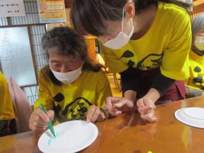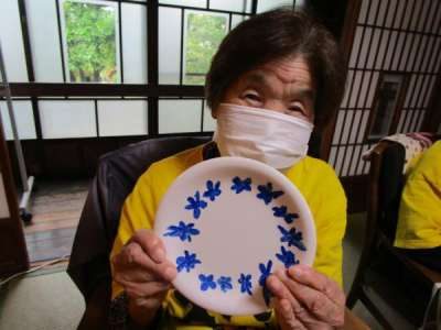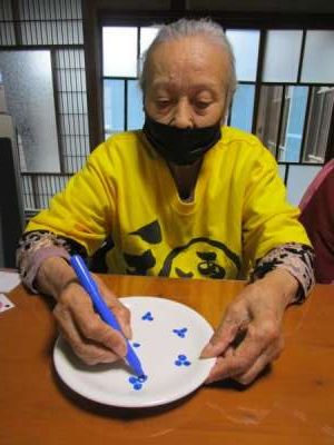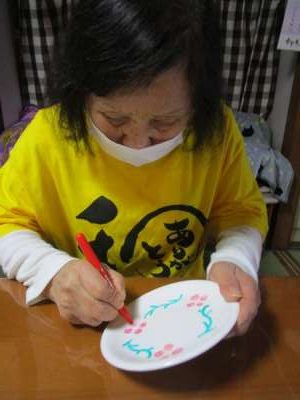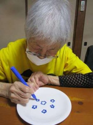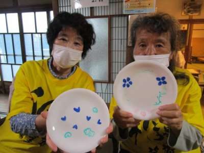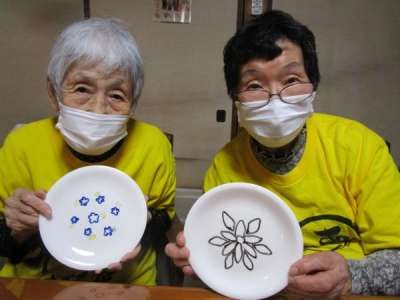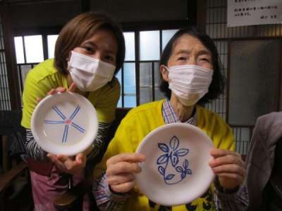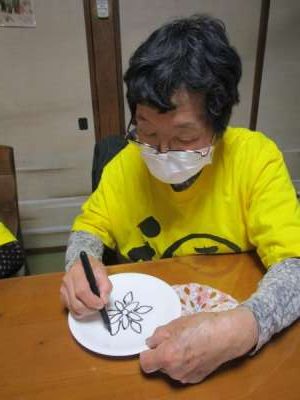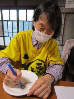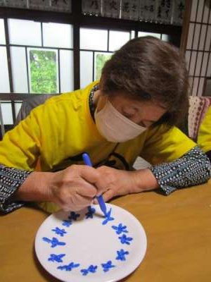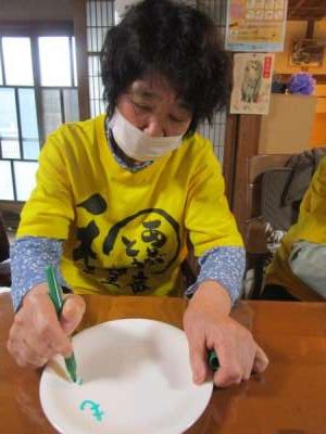 午後は皆さんで白いお皿にペンで絵付けをします