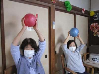 ボールを両手で上げて伸ばします右斜め上右斜め上右斜め上