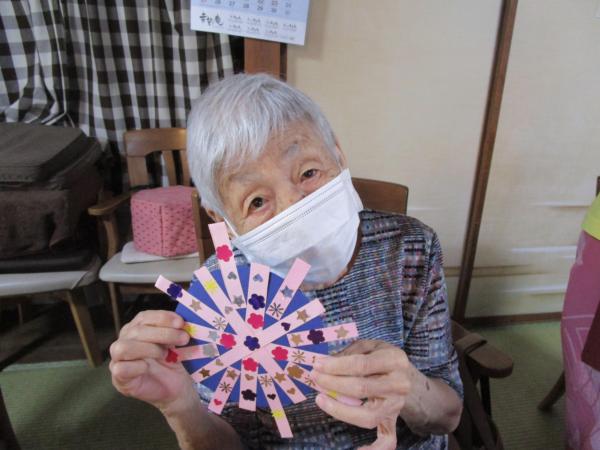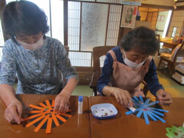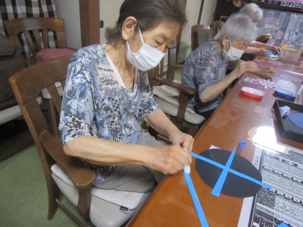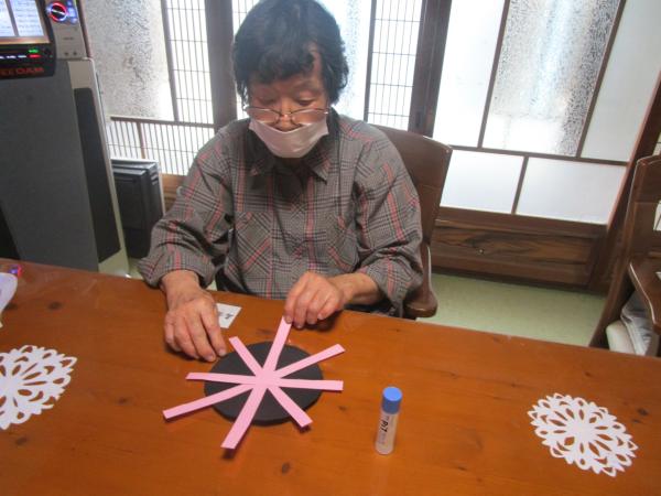 色画用紙の帯を放射線状に貼って花火の形にしていきます