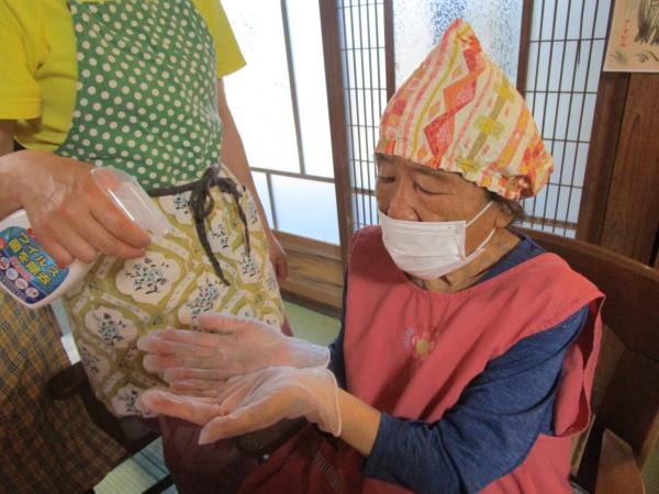 エプロン・三角巾・手袋・マスクをつけて手指消毒もしっかりと