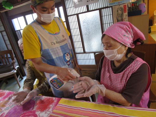 身支度を整え 手指のアルコール消毒