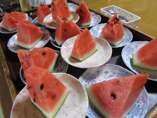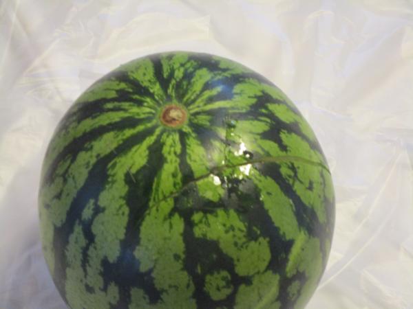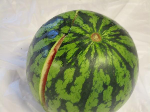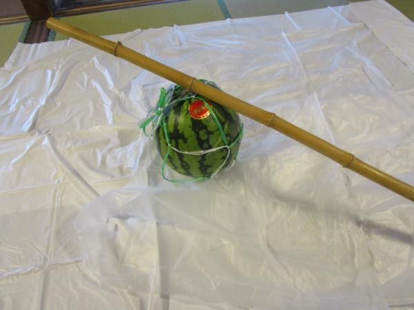 みんなに叩かれたスイカは 亀裂は入りましたが割れませんでした