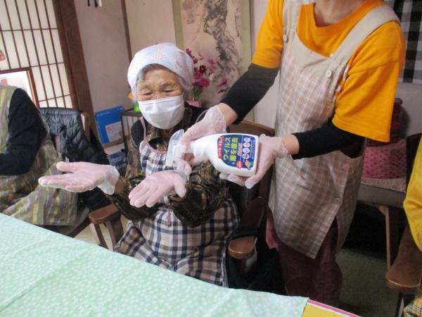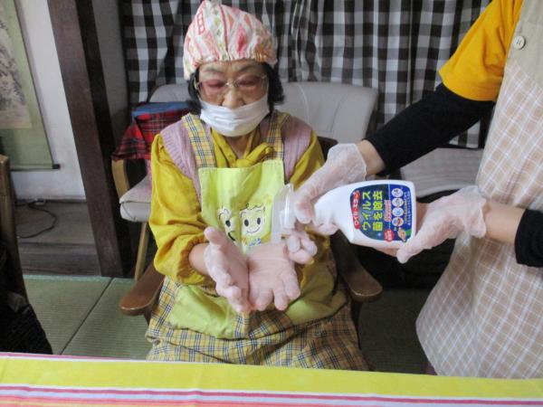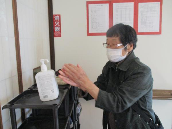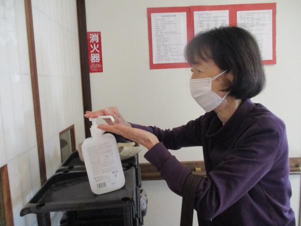 マスク着用 玄関でのアルコール消毒をしていただき手 (パー)