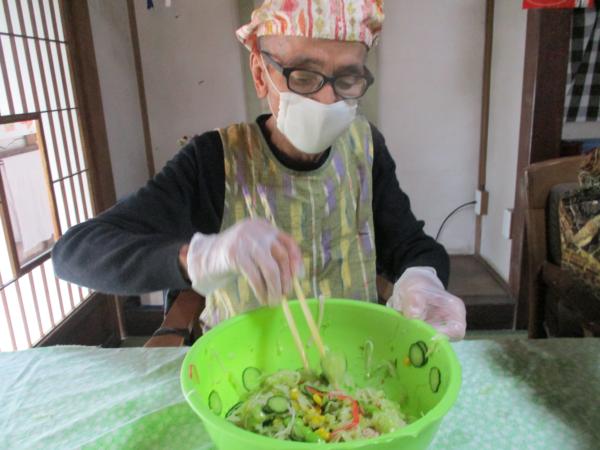 キャベツサラダに混ぜ合わせます  サラダ作りはは父にお任せ