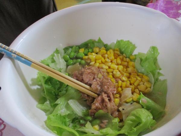サラダは、ドレッシングで和えて食べやすく