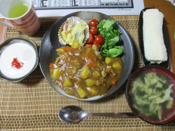 今日のメニューはカレーライス、玉子スープ、マカロニサラダ、ヨーグルトです。