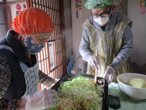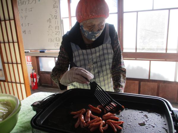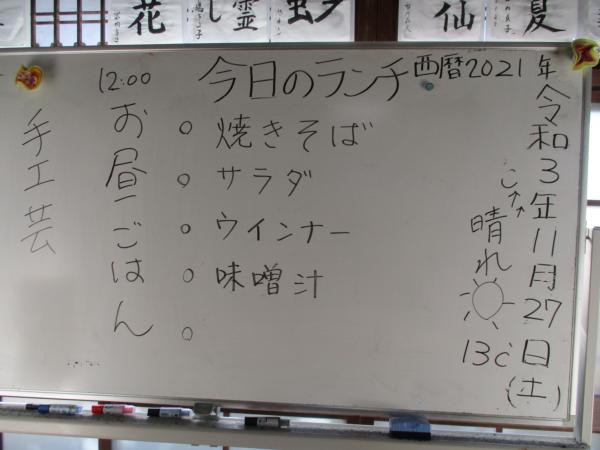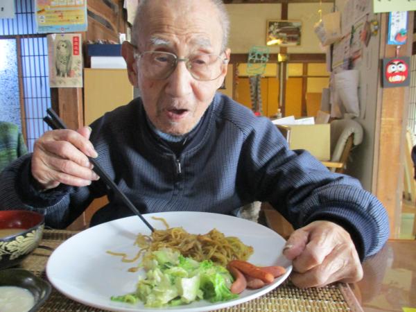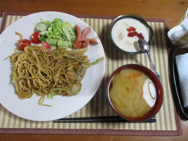 今日のメニューは焼きそば、サラダ、ウインナー、ヨーグルト、味噌汁です。