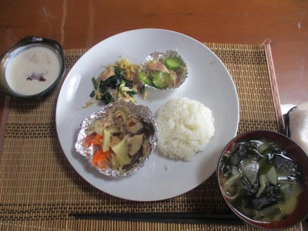 肉じゃが、ほうれん草のソテー、春雨サラダ、バナナヨーグルト、ご飯、みそ汁です。