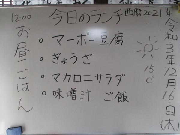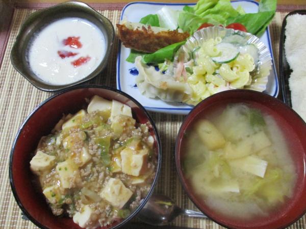 今日のメニューはマーボー豆腐、餃子、マカロニサラダ、豆乳バナナヨーグルトです。