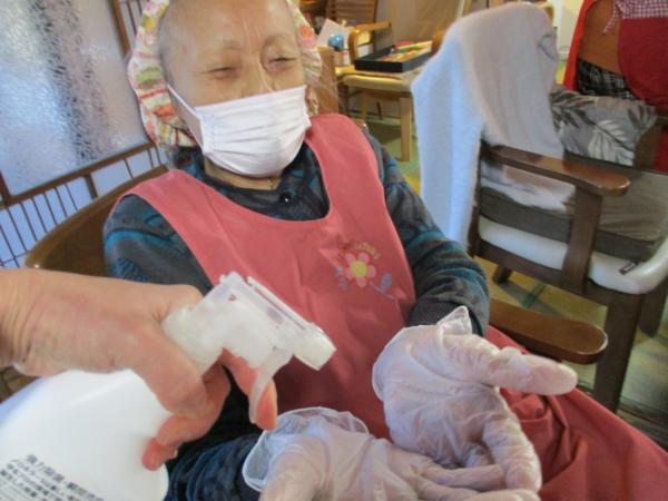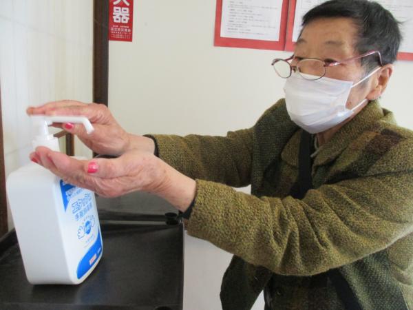 来庵してすぐに手指のアルコール消毒を行っています。