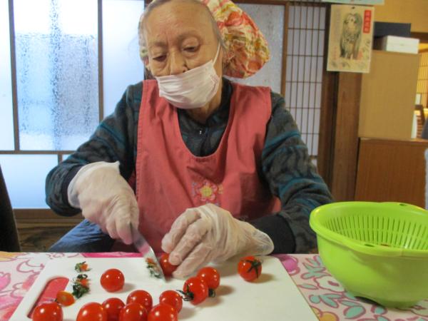 トマトのヘタを取ってから半分にして下さい。