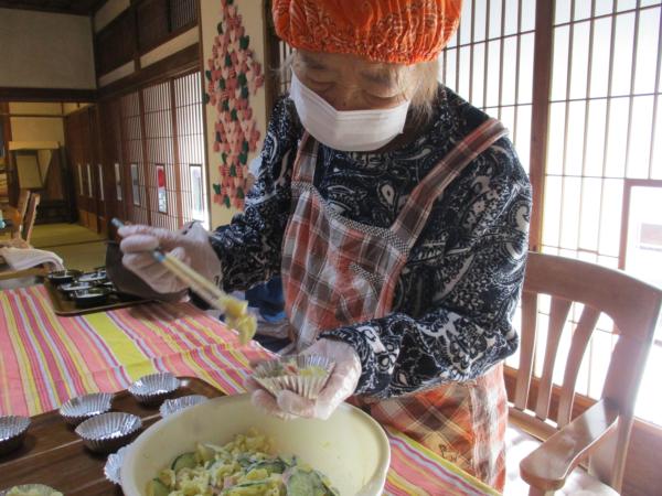 マカロニサラダを小分けして下さいね。