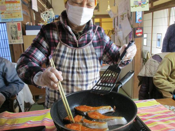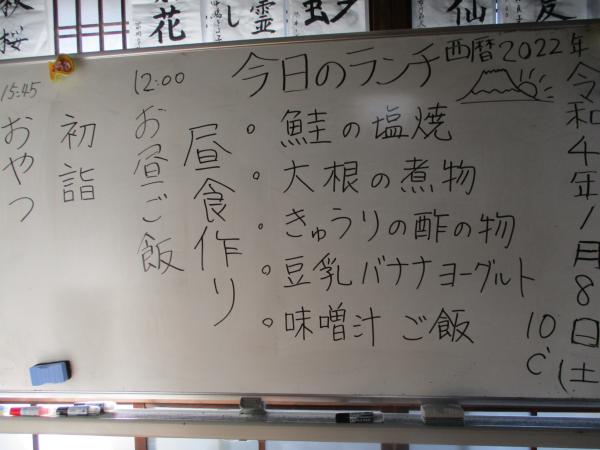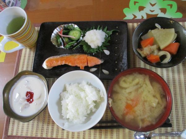 鮭の塩焼き、大根の煮物、きゅうりの酢の物、豆乳バナナヨーグルトです。