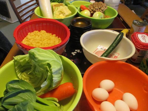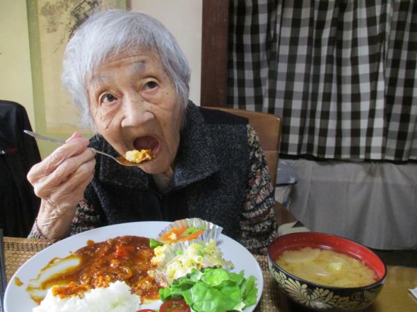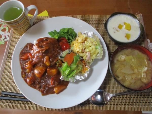 ハヤシライス、マカロニサラダ、野菜炒め、豆乳バナナヨーグルト、味噌汁です。