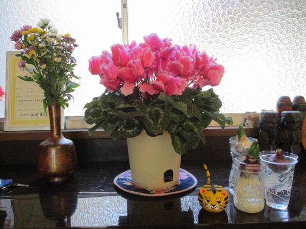 玄関ではシクラメンとヒヤシンスがお迎えします。