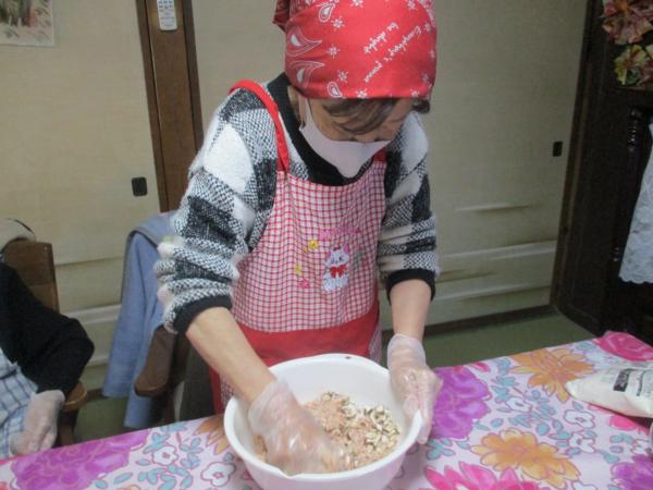 玉ねぎと挽き肉をよーくこねて