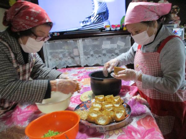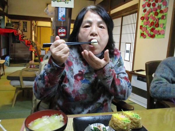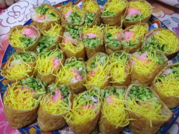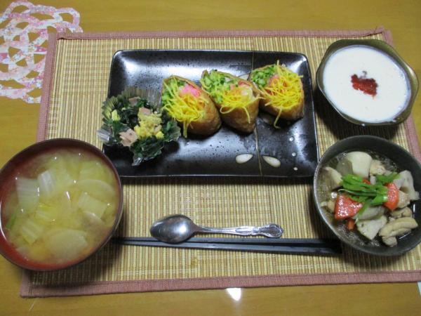 いなり寿司、筑前煮、ほうれん草のソテー、豆乳バナナヨーグルト、味噌汁です。