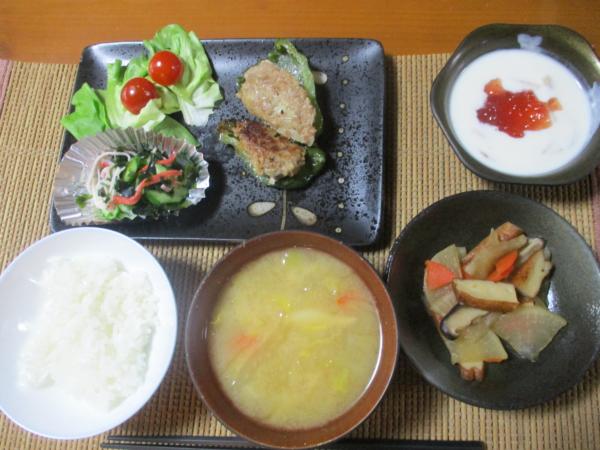 ピーマンの肉詰め、大根の煮物、きゅうりの酢の物、豆乳バナナヨーグルト、ご飯、味噌汁です。