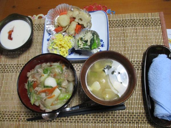 中華丼、筑前煮、小松菜の和え物、春雨サラダ、豆乳バナナヨーグルト、味噌汁です。