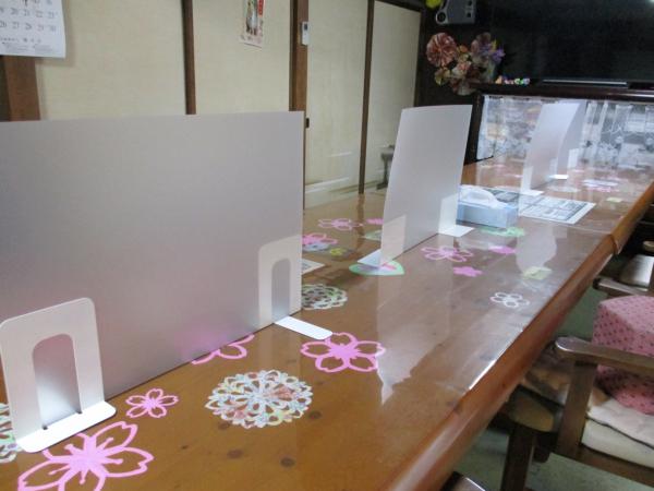 テーブルの中央には感染対策パネルを行い飛沫感染の予防をしています。