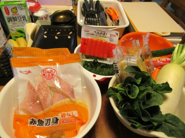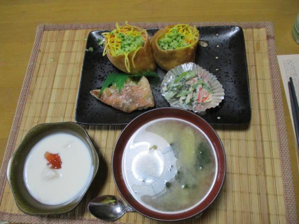 いなり寿司、春菊のマヨ和え、赤魚の煮付け、味噌汁、豆乳バナナヨーグルトです。