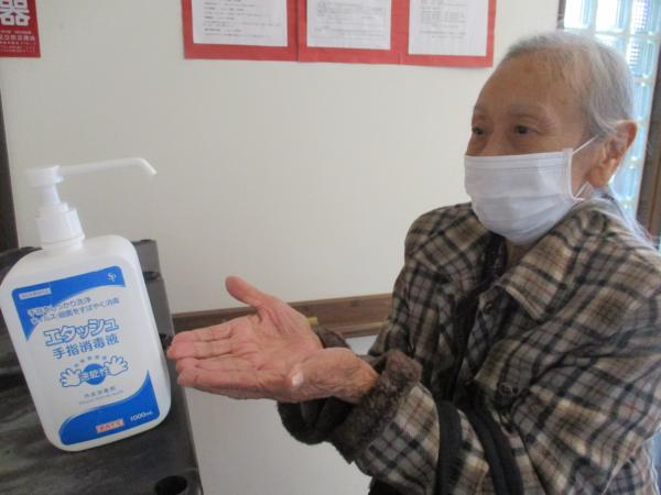 手指のアルコール消毒を行っています。