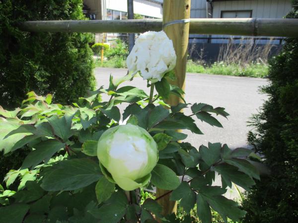 玄関前では真っ白な牡丹が今にも咲きそうです。